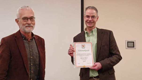 Eine weitere Überraschung hatte Kreisjägermeister Peter Boemans dabei. Boemans übereicht Roman Bauer die Goldene Ehrennadel des Landesjagdverbands. Sichtlich gerührt und stolz dankte Roman Bauer Peter Boemans und Matthias Steinmann für die Ehrung und das Geschenk.