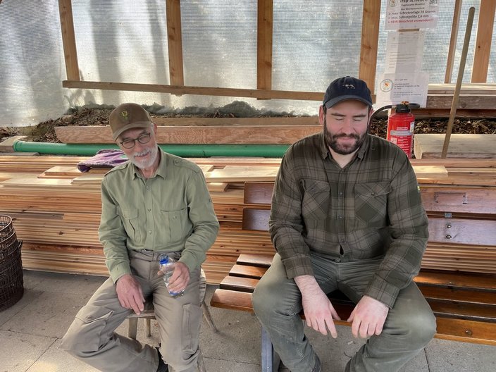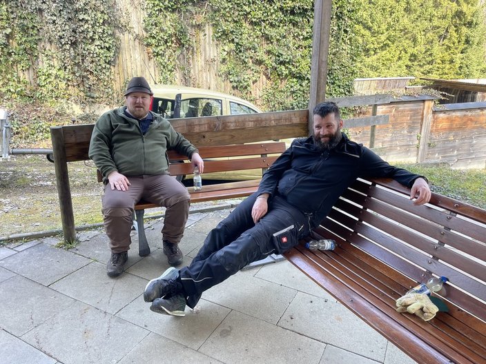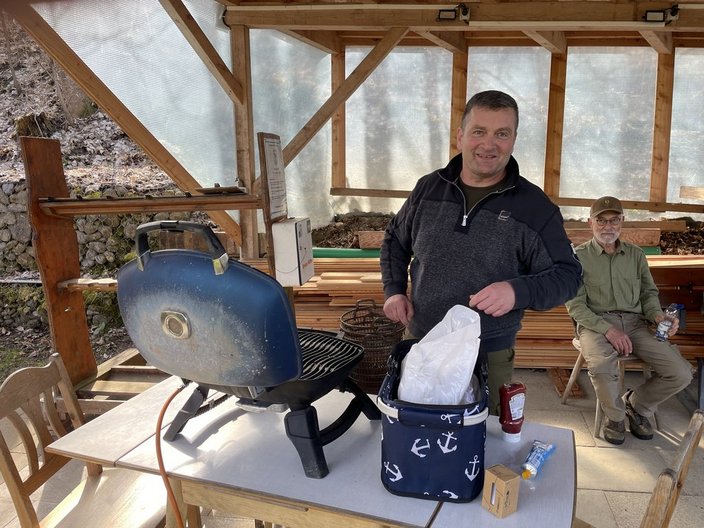 Nach 2,5 Stunden zumeist simpler Auflesearbeiten, teils auf Knieen unter den Seilzuganlagen, ließen wir uns den Mittagsimbiss mit Grillwurst, Kuchen und Erfrischungsgetränken schmecken. Die Stimmung beim „schaffe“ war gut und nebenbei konnten interessante und kurzweilige Gespräche geführt werden.